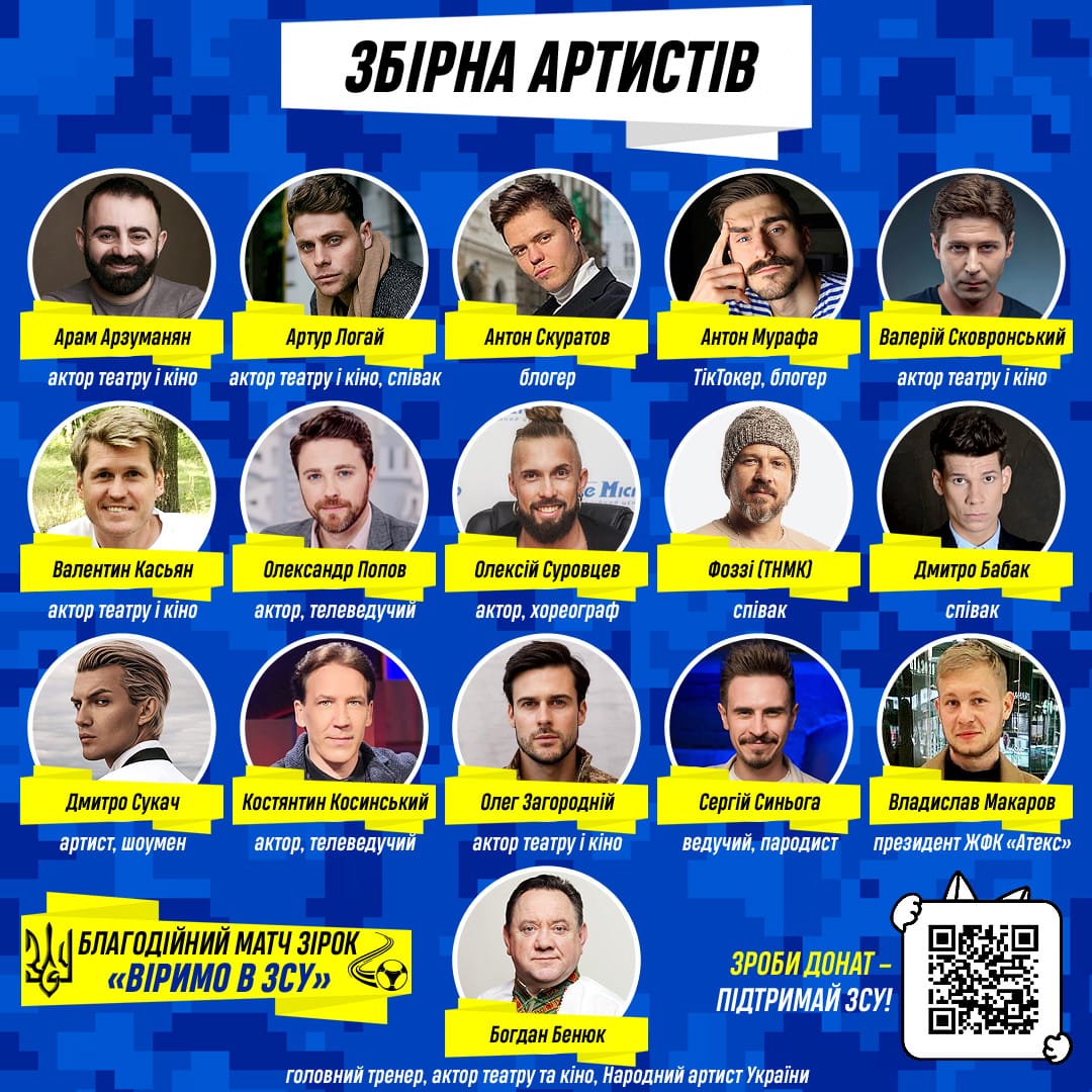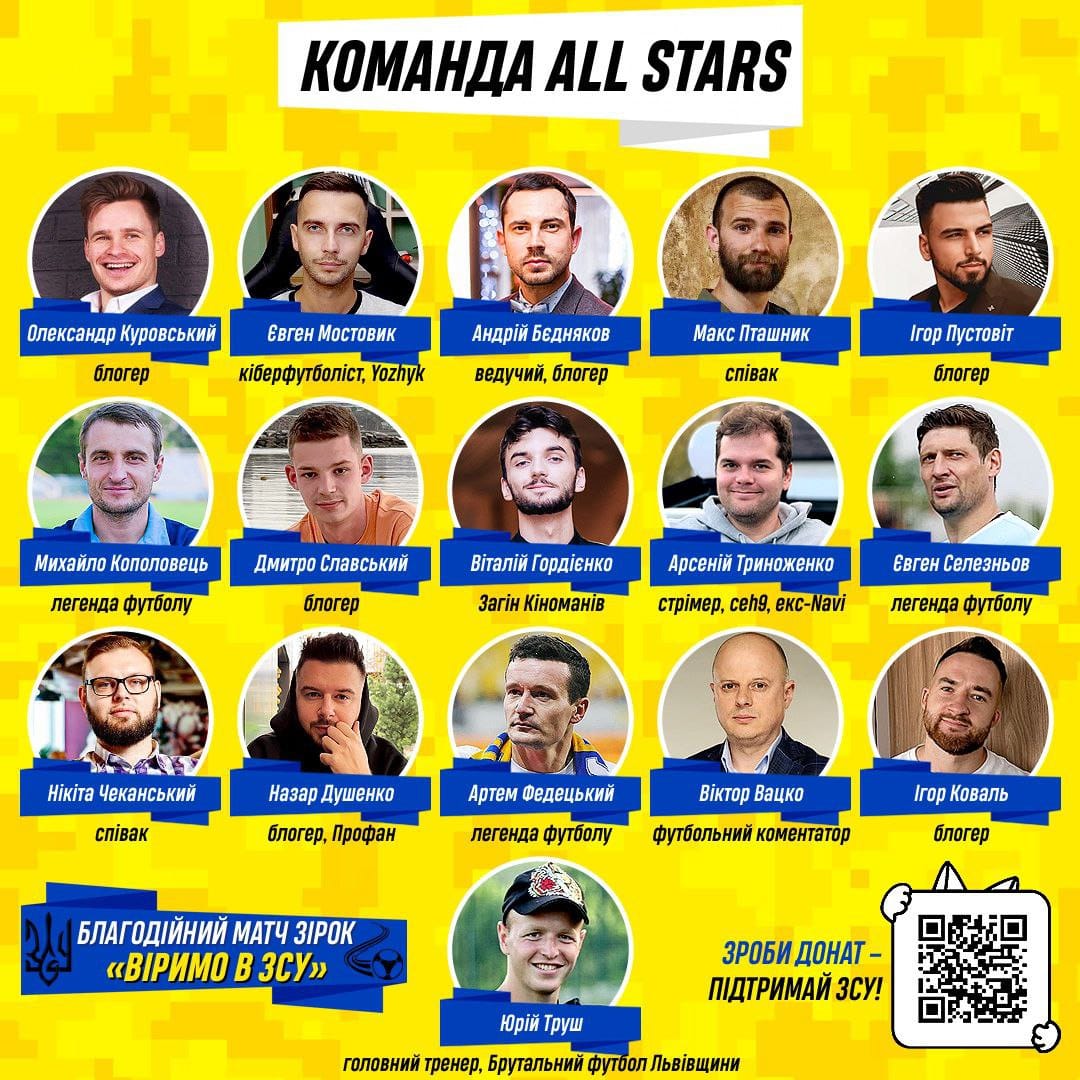 На футбольному полі зустрілися команда «ALL STARS» та народні артисти України. Матч мав символічну назву «Віримо в Збройні Сили України» і проходив у рамках проекту «Спорт розігріває».