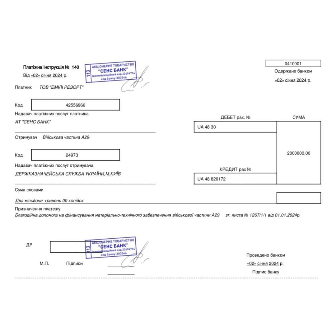„Jesteśmy bardzo zadowoleni, że możemy rozpocząć Nowy Rok 2024 w tak pożytecznym i przyjemnym celu – pomagając naszym obrońcom! Jak ogłosiliśmy, po raz drugi przekazujemy Siłom Zbrojnym Ukrainy dochód z uroczystości sylwestrowej w naszym kompleksie w wysokości 2 mln UAH, co daje łącznie 4 mln UAH. Dziękujemy naszym Bohaterom za uczynienie Ukrainy wolną i niepodległą w 2024 roku! I niech ten rok będzie rokiem Zwycięstwa!” – powiedział Emily Resort w oświadczeniu.
