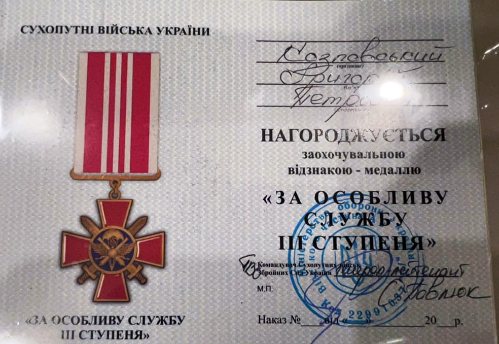 W szczególności, z rąk dowódcy Wojsk Lądowych Sił Zbrojnych Ukrainy generała porucznika Ołeksandra Pawluka, Hryhoriy Kozlovskyy otrzymał medal „Za Służbę Specjalną III Stopnia”.